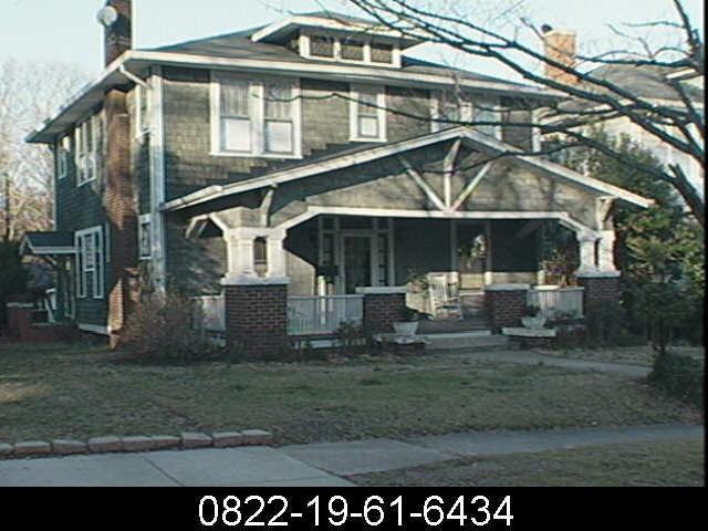 Distinctive frame Foursquare fronted by full-facade porch with bracketed eaves, decorative boards applied to shingled gable front, and three very short molded posts on a large brick plinth at each corner. Constructed 1923 by general contractor O.S. Williams as his own residence.