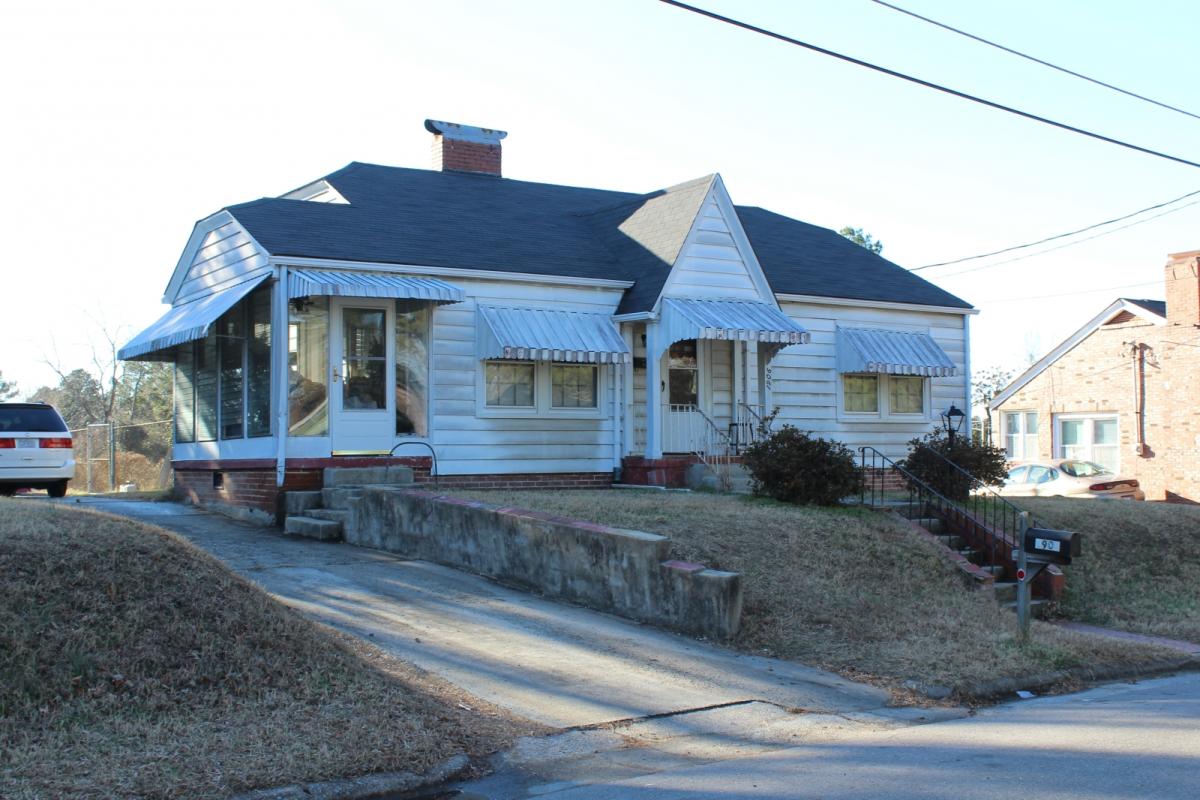 This one-story, clipped-side-gabled, Minimal Traditional-style house is three bays wide and triple-pile. The house has aluminum siding, six-over-six wood-sash windows, flush eaves, and an interior brick chimney. A solid wood door with three lights is centered on the façade under a shallow, steeply pitched, front-gabled porch supported by square columns. A window on the right (northwest) elevation has been boarded and a clipped-gabled porch on the left (southeast) elevation is enclosed with jalousie windows. There is a concrete wall along the northwest side of the driveway. County tax records date the house to 1947 and the earliest known occupants are John A. Leathers, a janitor at Liggett & Myers Tobacco Company, and his wife, Etta Leathers, in 1950.