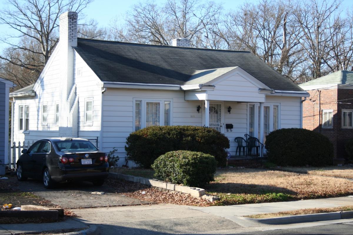 This one-story, side-gabled Minimal Traditional-style house is three bays wide and double-pile with a full-width, gabled rear wing. The house has aluminum siding, six-over-six wood-sash windows, an interior brick chimney, and an exterior brick chimney on the left (south) gable end. The replacement front door, centered on the façade, is sheltered by a front-gabled roof supported by vinyl columns. It is flanked by fifteen-light French doors, each with five-light sidelights. There is a shed-roofed enclosed porch near the rear of the right (north) elevation with a basement-level entrance below the porch and basement-level glass block windows on the north elevation. The earliest known occupant is Viola G. Thompson, an office secretary at NC Mutual Life Insurance Company, in 1940 and the first female member of the company’s board. By the late 1950, the house was occupied by George and Rosemond Cox, both employees at NC Mutual.