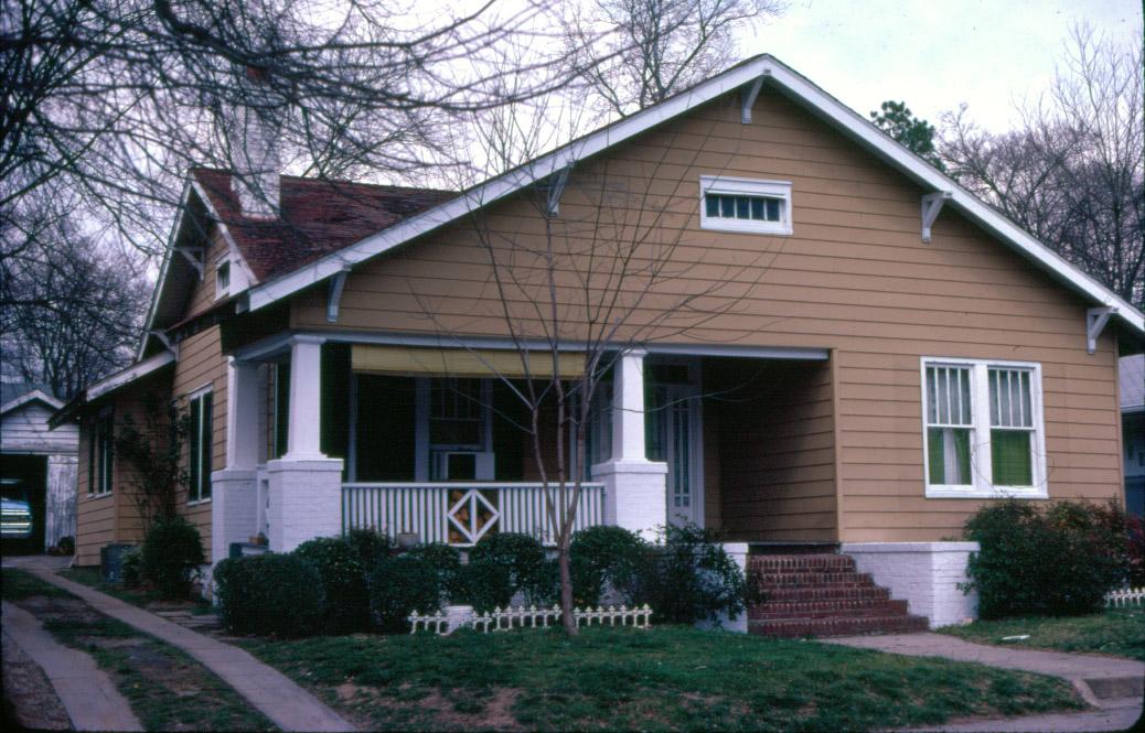 Rambling one and one half story bungalow with aluminum siding. Front facing gable over porch, two side gables on main body swing triple A effect. Wraparound veranda along side of house and half of front with bungalow piers.