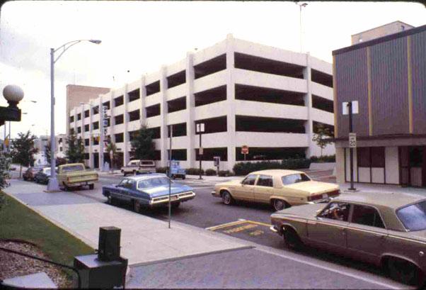 Looking southeast from the post office; the former Orange St. is between the unfortunate 322 E. Chapel Hill (clad in brown and white) and the parking deck.