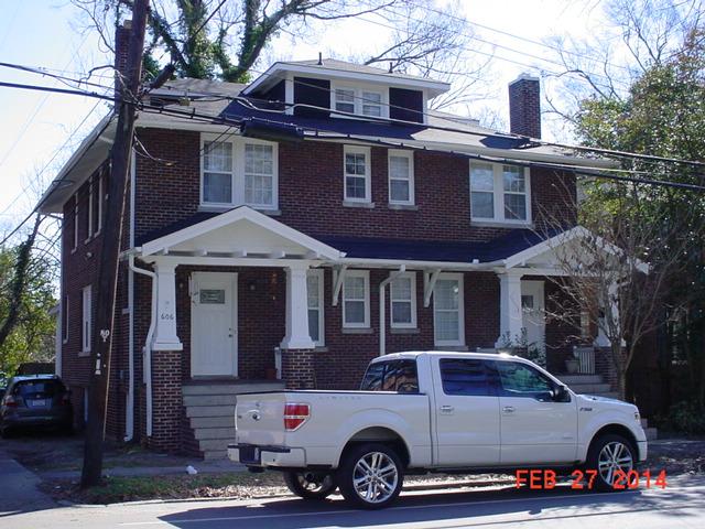 This late 1920s two-story brick-veneered duplex is distinguished by a hip roof with central dormer, wide eaves with exposed rafter ends, nine-over-one windows, stepped single-shouldered chimneys, and gabled porch roofs. Porch supports are tapered box posts on brick plinths.
