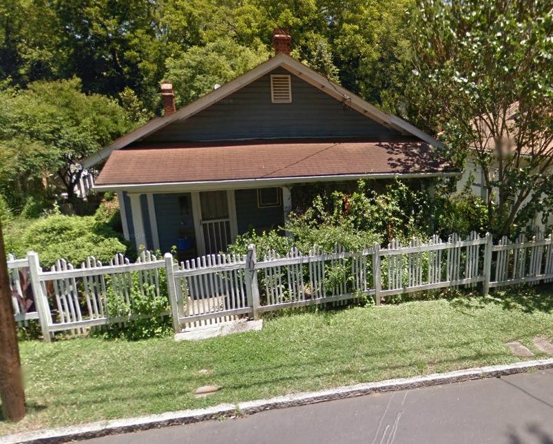 Small front-gable Craftsman-style house with German siding, exposed rafter tails, 4-over-1 sash windows, 2 interior chimneys, and a shed porch with tapered posts and a simple railing. John A. Dowd, collector Shepherd Fumiture Co., occupant in 1930.