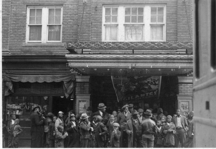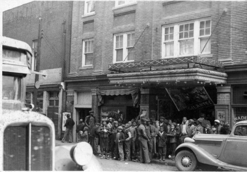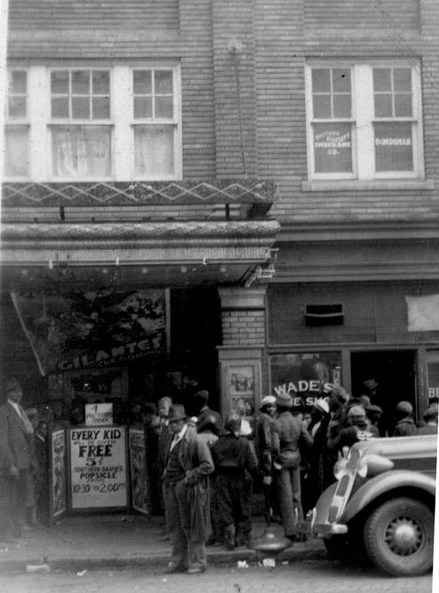 Information from two of the photos helps piece together the name of the shop on the right: Wade's Wine Shop. The store on the other side of the theatre is Wade Cornish Café. So I googled people named Wade Cornish who lived in the South (note: free "Southern Dairy" ice cream on sign) and found a Jessie Wade Cornish living in Forsyth County during that time. Notice that the "Wade Cornish" is not centered over the word "Café" so there was probably an omitted first initial, which I'm guessing is "J." So, probably Winston-Salem. So I looked up theatres in W-S that catered mainly to African-Americans and found this photo in DigitalForsyth's searchable database under "theatre." Gotta be Lincoln Theatre.